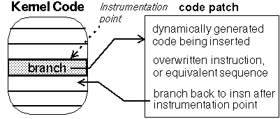 Kerninstd splices by overwriting the instrumentation point instruction with a branch to patch code. The code patch contains the dynamically generated code, the original overwritten instruction, and a jump back to the instruction stream after the instrumentation point. Figure 5 illustrates this basic design.