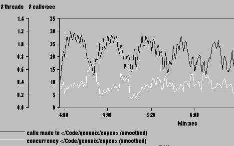 Previous studies of proxy servers have shown file opens to be a common bottleneck, so we first measured the kernel function copen, which handles both file open and file creation. As shown in Figure 11, it is called 20-25 times per second, and averages about 0.4 threads executing within this code at any given time. Since Squid is a single-threaded program, this means that on average, 40% of Squid's elapsed time was spent either opening existing files for reading, or creating new files for writing.