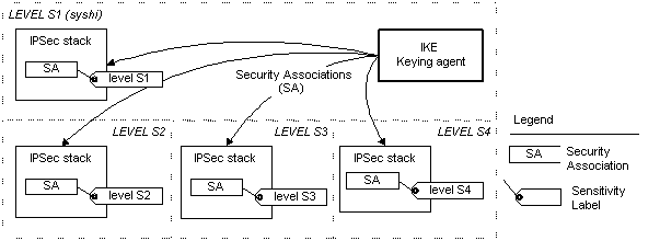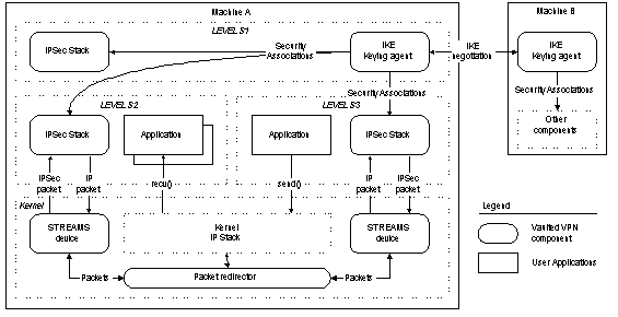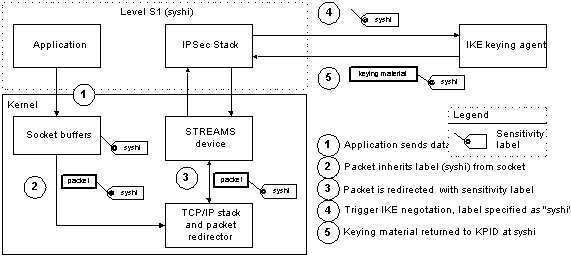 The traditional monolithic kernel-level IPSec stack has been changed instead to a series of compartmented, concurrent user-mode processes. In order to make possible the processing of network packets in compartmented user-mode processes, the target platform of the Vaulted VPN is a version of HP-UX 10.24 that has been modified to perform packet redirection by means of a simple kernel-level add-on. The kernel level add-on is necessary as this particular version of the HP-UX operating system uses a BSD-style [10] IP stack that needs to be modified to include packet redirectors. This architecture (see Figure 1 ) of the Vaulted VPN consists of: 1. a kernel-level add-on for packet redirection from the kernel to a STREAMS [14] device 2. a series of concurrently executing user-mode IPSec stack-processes running in different compartments. These processes intercept redirected packets from the kernel and perform IP fragment re-assembly and the actual encryption and decryption of IPSec packets [4] [5]. 3. a user-mode IKE [1] keying-agent, which performs negotiations with its remote peers in order to derive keying-material in the form of IPSec security-associations for use in encryption and decryption of IPSec packets. The IKE keying-agent performs the negotiations needed to derive the keying-material used in IPSec processing. This keying-material for IPSec security-associations is sent to the various IPSec stacks using a protected message-queue described later. 4.3 Packet Flow In the Virtual Vault operating system, each packet travelling up or down the network stack is labeled with a sensitivity-label. The kernel has been slightly modified to intercept all incoming and outgoing packets and pass them to a STREAMS-based driver to be queued for further processing. Once queued at the STREAMS-driver, the packets will eventually be read by a user-mode IPSec stack and be processed there. Each IPSec stack is a separate user process linked to the kernel IP-stack via a STREAMS-based driver. Typically, there is a separate stack for each sensitivity level on the system. Upon startup, the IPSec stacks send a message to the STREAMS-based driver in the kernel to indicate the level that the stack is at. This mechanism of run-time configuration can be abused and many ways exist to counteract this. As an example, one could check the system-supplied user-credentials in the STREAMS-based driver whenever a process attempts to open the driver. Using this message, the kernel demultiplexes the stream of labeled IP packets to the various user-mode IPSec stacks depending on the value of the label registered previously. This process is purely a simple comparison - the label of each packet has to match the label of a previously registered IPSec stack before the packet can be routed to it. Duplicate IPSec stacks attempting to register using the same label are ignored. The ability of HP-UX 10.24 to label network packets within the kernel allows the Vaulted VPN to distinguish between packets that are destined for different compartments and to route the packets accordingly. Incoming packets are labeled with the sensitivity-label of the network-interface from which the packet originated. Outgoing packets obtain their labels from the security-attributes of the socket that generated the packet. Because all network packets are labeled internally within the kernel, it is possible to redirect these packets to separate compartments based on their labels and operate on a compartmented basis. This implies a use of MAC controls that has not yet been described fully. The notion of handling and routing packets on a compartmented basis is a logical extension of the segmented nature of trusted operating systems. Where packets within the kernel used to be processed together regardless of their labels, there now exists some form of segmentation within the network protocol stack of the operating system. This notion can be extended to many other system components, but this report does not explore it any further. 4.4 IPSec Stack - Basic Operation Each IPSec stack imposes a security-filter on the incoming and outgoing packets. Each time a packet is received from the kernel, the security policy database [2] internal to the IPSec stack is consulted to see if the packet should be processed, dropped or bypass IPSec processing. If no matching entry is found in the policy database, the packet is dropped. If the policy database specifies that an incoming packet requires IPSec processing, the packet is then inspected to see if IPSec decryption can take place based on the security-descriptors present in the packet. If the decryption processing completes successfully, the decoded packet is sent back to the kernel via the STREAMS-driver to travel up the network protocol stack, usually to a socket's receive-buffer. For outgoing packets, the security policy database is consulted to see if traffic to the destination specified by the outgoing packet is allowed, and if so, what kind of processing to apply to it. If the outgoing packet is to be IPSec-encrypted, then the relevant encryption-processing is applied and the encrypted packet sent back to the kernel to be subsequently sent out the network interface. Packets banned from transmission by the security policy database are dropped. 4.5 Message Interfaces The individual IPSec stacks use standard UNIX message-queues to communicate with the IKE keying-agent. These queues are used to trigger IKE negotiations and to pass keying-material from the IKE keying-agent to the individual IPSec stacks. The IPSec stacks also use a kernel-to-user-mode interface in the form of a STREAMS-based driver to send and receive IP packets from the kernel. These interfaces are protected using methods described later. 5 Compartmented Keying Material Negotiations to form a new IPSec security-association are normally triggered by an outgoing packet that does not have a matching entry in the security-policy database. In such a case, a message i