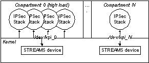 5.2 Labeled Distribution of IPSec keying material When IKE negotiations are successful, the keying-material derived in the form of IPSec security associations is sent via a private key-channel to the IPSec stack at the same sensitivity-level. The IKE keying-agent does not hold IPSec keying-material beyond the short duration required to derive it and pass it on to the individual stacks. The net result is that keying-material is segmented according to its sensitivity-label (see Figure 3 ). The keying-material in any given stack is never duplicated in another, leading to cleanly segmented, non-intersecting subsets of the original keying-material. 5.3 Storage of non-volatile IKE private keys Private keys used by the IKE keying-agent to digitally sign messages in IKE main-mode negotiations are stored as files and are protected by setting them to the highest sensitivity level, syshi. Like the IKE agent, a dedicated compartment would be preferable, but syshi is chosen given the static configuration of compartments in HP-UX 10.24. The appropriate permissions-bits are also used to disallow access by everyone else but the VPN pseudo-user. Further measures, including encrypting the keys with a passphrase that is supplied when the Vaulted VPN is started, could be employed but has not been implemented in the current version of the Vaulted VPN. 6 Security Analysis This section presents a security analysis of various aspects of the operation of the Vaulted VPN. We show how the underlying security-features of a Trusted Operating System are used to isolate and protect the various components of the Vaulted VPN. This is done by examining the system from several aspects - the component processes, the messaging-interfaces between the components and the keying-material travelling between the components. Taken together, this view of security based on the components and their interfaces forms the basis of the security of the Vaulted VPN. 6.1 General security measures Each component is run with an effective user-id of a VPN pseudo-user. This user is specifically created for use by Vaulted VPN components only and cannot logon to the system under normal circumstances. This arrangement allows the use of UNIX-style permission-bits to disallow access by non-Vaulted VPN components. The use of system provided file-control databases ensures that only the Vaulted VPN components are assigned this pseudo-id, and allows the use of DAC controls as a more powerful discriminant that would otherwise be possible on standard UNIX systems. The chroot UNIX-command is used to place each executable component into a restricted filesystem to limit the scope of accessible system files should a security breach occur. In other `full-blown' CMW systems, it is possible to place each component in a separate compartment of its own. However, HP-UX 10.24 offers a static configuration of compartments. Therefore, the safest choice is to place the sensitive components (like the IKE agent) at the highest sensitivity level possible, assuming that this level is not used by very many other processes in a properly configured system. As a general rule, the IKE keying-agent is placed into the highest-classification possible to isolate it from other processes in compartments of a lower classification. The IKE agent executes with enough privileges to perform certain privileged network operations (such as binding to the IKE-reserved port number), but is otherwise relatively unprivileged. The IPSec stacks are given almost no special privileges at all because their activities consist almost solely of reading and writing to a device file. Therefore, faults in the Vaulted VPN IPSec stacks do not give root-equivalent access, compared to the situation where a breach in an IPSec stack situated in the kernel allows access to the entire operating system. 6.2 Compartmented Component Processes The approach taken here is to compartmentalize the various component processes of the Vaulted VPN to isolate them from each other and the rest of the system as much as possible. The individual IPSec stacks are also placed into separate compartments, each at different sensitivity levels - typically one stack per compartment. By using this approach, a fault in the IPSec stack in a given compartment does not automatically cause the processing of other stacks to fail (see Figure 4 ). More importantly, it does not lead to a breach in security for those other stacks. 6.3 Compartmented Keying-material Keying-material derived from successful IKE negotiations is never kept in a single location with the IKE keying-agent. Instead, it is considered as labeled according to the sensitivity-level of the network packet that initially triggered the negotiation and once derived, is distributed to the appropriate IPSec stacks. The net effect is that the keying-material is only present in the compartment in which it is to be used. This reduces the visibility of keying-material associated with highly sensitive network connections and eliminates the mingling of keying-material found in systems where the entire IPSec stack resides in the kernel. 6.4 Protection of component interfaces There are two main messaging interfaces in the Vaulted VPN which need to be protected: 1. The keying-channel between the IKE keying-agent and the various IPSec stacks 2. The kernel-to-user-mode STREAMS interface between the kernel IP stack and the various user-mode IPSec stacks The keying-channel between the IKE keying-agent and the various stacks is a standard message-queue. Protection of this interface is through a combination of Mandatory and Discretionary Access Controls. The IKE keying-agent and stacks are launched under a special pseudo-user. The message-queues are then owned by this pseudo-user by virtue of inheritance and are created with permissions-bits that disallows access by everyone else. This restricts access to the queue to the Vaulted VPN components only, since they are the only components on the system t