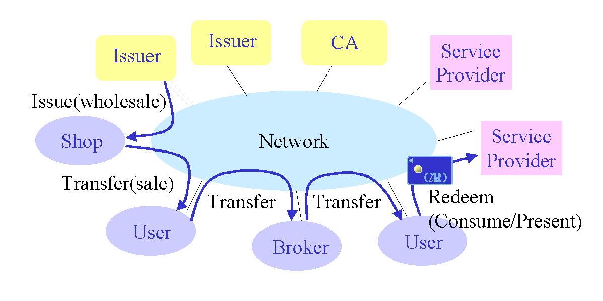 The issuer and service provider can be the same physical organization. Additionally, a shop, broker, or other participants exist in real paper ticket circulation but they are not included in the settlement because they are treated as users who buy tickets from issuers (or users) and transfer the tickets to other users with payment. 2.2 Digital ticketIn this paper, a digital ticket (or ticket) is defined as SignedI (I, P, O), where I is the ticket issuer, O is the ticket owner, and P is a promise to the ticket owner. The phrase "SignedI" means that the entire block is signed by the issuer's digital signature. Promise P has several sub-properties that represent various rights depending on the application.2.3 TransactionCirculation of a digital ticket comprises three types of principal transactions:Issuance is an action in which issuer I gives ownership of ticket T to user U. In our model, we assume that this transaction is implemented by issuer I creating ticket T = SignedI (I, P, U) and sending it to user U.Assume that a ticket was circulated between participants I->U0->U1->...->Un->S, using the transactions of issuance, transfer, and redemption. A set of tickets T, Tt1,...,Ttn, Tr, called a transfer list, is sent to the service provider as a result of the circulation. We use the transfer list to detect who transferred or redeemed a ticket more than once after fraud is detected. Our prototype system also offers an offline fraud prevention scheme using a smart card, but this scheme is beyond the scope of this paper. Generally speaking, money, services, or products are circulated against the flow of the tickets. There are issues on how the atomicity between these two delivery flows is guaranteed [6]. This paper, however, focuses only on the ticket flow and makes payment methods independent because this approach enables easy integration with legacy application systems that use existing payment systems. Of course, integration with payment methods is an important issue to be studied. 3. Circulation Control SchemeIn this section, we present an approach to satisfy the design goals described in Section 1: business scheme flexibility, management autonomy, and simplicity.3.1 RequirementsBusiness scheme flexibility is realized by establishing a general circulation control scheme that can handle various circulation requirements some of which are described below: