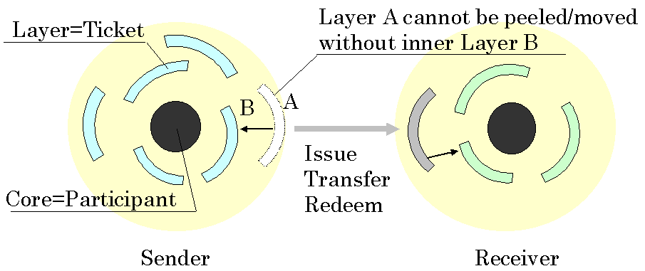 3.2 Onion ticket accumulation modelWe found that the above requirements can be satisfied by checking if the participants of a transactions have certificates confirming their qualifications before conducting the transaction. To represent these qualifications, we introduce circulation control tickets. The circulation requirements are specified by what type of circulation control tickets are required for each type of ticket to be circulated, and separate requirements are specified for the sender and receiver. The ticket circulating system issues, transfers, or redeems a ticket only if all circulation requirements are satisfied. The circulation control tickets themselves can be any type of digital ticket, e.g., a driver's license, certain membership certificate, or other certificates issued by a CA, and these tickets can be recursively circulated using the ticket circulating system. We call this scheme the onion ticket accumulation model (Figure 2).In this model, the identity of a participant forms the onion core, and the rights (tickets) given to the identity form the layers beyond the core. A transaction is conducted between two onions (participants). The model illustrates that an outer layer (tickets) cannot be peeled or moved to another onion unless inner layers (tickets) exist. For example, a plane ticket can be modeled using circulation conditions as shown in Table 1. A plane ticket can be issued and punched by the airlines that have an airline certificate issued by the International Air Transport Association (IATA). A plane ticket can be transferred by the travel agencies who have a travel agent certificate issued by a government, while the public is prohibited from transferring the tickets to anybody else. The next issue is how and where these circulation requirements are defined in the system. We describe this issue in the following sections.