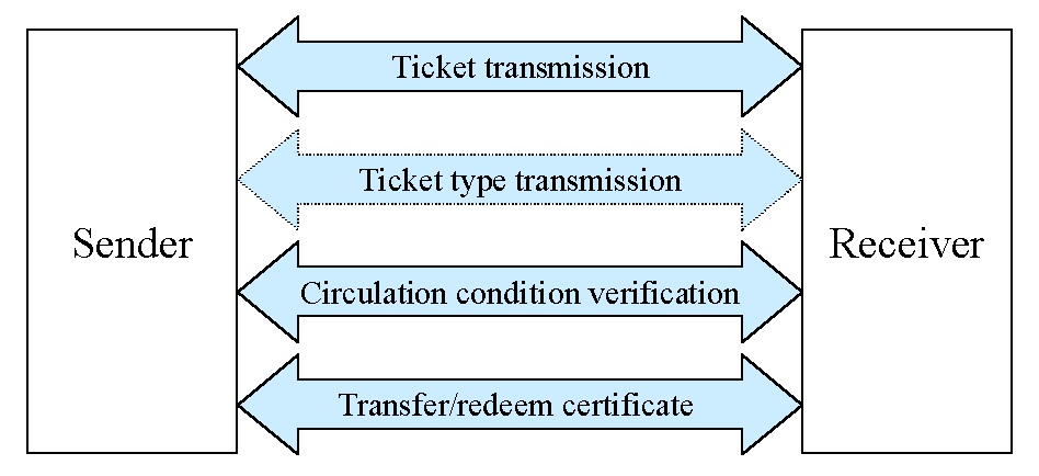 This trust management scheme enables users to detect a forged ticket regardless of the circulation route, and can be performed mechanically by the proposed type verification procedure. This scheme also provides easy management of the basis of trust since the user need manage only one type definition for each type of ticket, even if complicated issuer conditions are set. 5. Overview of Implementation5.1 Generalized ticket definition languageWe proposed to implement the Generalized Ticket Definition Language on top of RDF [18], which, in our previous paper [9], is layered on XML [17]. Our current implementation, however, uses XML directly [12]. The reason for this is because RDF is too rich and redundant to describe circulation conditions or other properties for controlling ticket circulation, which are common to all tickets, and the semantics are not important except with regard to the Promise property.The standardization of XML signed documents [5] is now being actively discussed in W3C and IETF. Our current specification does not comply with these specifications but integration with any future standard is an important issue to be studied. 5.2 ProtocolsThe ticket circulation protocols are overviewed in Figure 3. First, a definition for the ticket to be circulated is sent to the receiver in order to send the circulation conditions. In this phase, ownership is not transferred. Second, the receiver checks if the ticket type of the ticket definition is in the receiver's ticket type book. If not, the receiver obtains the type definition in some way, e.g., from the sender or network. Third, the receiver and sender check if the circulation condition is satisfied. In this phase, tickets that must be owned by the sender or receiver are checked against each other. Finally, ownership is transferred from sender to receiver by sending a transfer or redemption certificate.We have implemented a prototype of the above protocols using Java and confirmed its feasibility. We also implemented three common components on top of the protocol handling system: ticketing server, ticket examination server, and ticket wallet.
