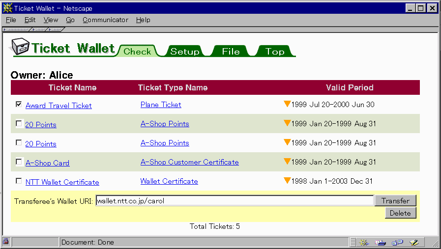 Figure 4. Ticket wallet displayed in a Web browser 6. Related WorkKeyNote [3][4] presents an authorization control system that determines whether actions are consistent with policies, which are a collection of certificates called assertions. We present here a ticket circulation system that determines whether issuance, transfer, and redemption requirements are consistent with the sender or receiver qualification conditions. In this sense, our approach is similar to but more specific than KeyNote and is focused on ticket circulation. The KeyNote system uses a general programmable language to define assertions, whereas our system uses a ticket type based specific language to allow high-level control descriptions.SPKI [8] and PGPticket [11] present an authorization control system that provides a mechanism for deriving authorization decisions from a collection of certificates. They provide the ability to delegate fine-grained authorization from one person to another. These systems, however, do not introduce certificate transferability, in which the transferor loses the rights when the certificate is transferred. As a result, it is difficult to realize event tickets or other tickets that can be consumed only once, although we note that it can be applied to license or pass-type tickets. The Eternal Resource Locator [1] presents a scheme to establish trust without relying on any PKI. This scheme uses the hash value of the root hypertext document as the basis of trust. Our scheme has similarities to this in that the hash value of the type definition is used as the basis of trust. NetBill [6] presents an authorization scheme, in which a customer's authority is represented by an identity ticket, which is a pseudonym of the customer, and one or more credentials, each of which represents proof of group membership. This model has some similarities to our onion ticket accumulation model. The NetBill system introduced this model mainly for flexible price control, whereas our model is used to increase the flexibility of circulation control. Capability cards [13] represent a digital media that can circulate various types of digital objects including digital rights using a card metaphor. However, they do not provide flexible circulation control or trust management, both of which are offered by the schemes proposed in this paper. 7. ConclusionThis paper described issues and design goals for a generalized ticket circulation system that can circulate the various types of digital tickets required in diverse business schemes. To enable flexible control of ticket circulation, we specify circulation control tickets. Before issuing, transferring or redeeming a ticket, the sender or receiver must have the appropriate circulation control tickets. We define a ticket in two parts, ticket type and individual ticket information, and use the type identifier to specify the circulation control tickets required. These schemes make it possible for any type of ticket, e.g., driver's license or social security certificate, to be used as the PKI for ticket circulation in addition to identity certificates issued by a CA. We also proposed a new trust management scheme based on the trust of ticket type definitions. This scheme enables users to mechanically verify the trust of a ticket by executing the proposed ticket type verification procedure.AcknowledgementThe authors wish to thank Yoshiaki Nakajima, Yoshihito Oshima, Masayuki Hanadate, Nobuyuki Chiwata, Tomoji Takehisa, and Takaaki Matsumoto for useful comments and discussions.References