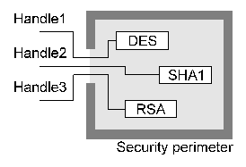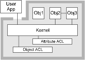 Figure 4. Architecture security model 5. Object Security and Access ControlThe most important security feature of the architecture is that each object is contained entirely within its security perimeter, so that data and control information can only flow in and out in a very tightly-controlled manner, and that objects are isolated from each other within the perimeter by the security kernel. For example once keying information has been sent to an object, it can't be retrieved by the user except under tightly-controlled conditions (the only real case where this can occur is when an object's ACL permits a short-term session key to be exported in encrypted form, or a private key to be stored in encrypted form to a permanent storage medium such as a smart card or disk). In general keying information isn't even visible to the user, since it is generated inside the object itself and never leaves the security perimeter. This design is ideally matched to hardware implementations which perform strict red/black separation, since sensitive information can never leave the hardware. Associated with each object is a mandatory access control list (ACL) which determines who can access a particular object and under which conditions the access is allowed. At a very coarse level, each object has a mandatory access control setting which determines whether it is externally visible or not (that is, whether it has a handle which is valid outside the security perimeter). Only externally visible objects can be (directly) manipulated by the user, with ACL enforcement being handled by the architectures security kernel. Another ACL entry is used to determine which processes or threads can access an object. This entry is set by the object's owner either when it is created or at a later point when the security properties of the object are changed, and provides a much finer level of control than the internal/external access ACL. Since an object can be bound to a process or a thread within a process by an ACL, it may be invisible to other processes or threads, resulting in an access error if an attempt is made to access it from another process or thread. A typical example of this ACL's use is shown in Figure 5, which illustrates the case of an object created by a central server thread setting up a key in the object and then handing it off to a worker thread which uses it to encrypt or decrypt data. This model is typical of multithreaded server processes which use a core server thread to manage initial connections and then hand further communications functions off to a collection of active threads.