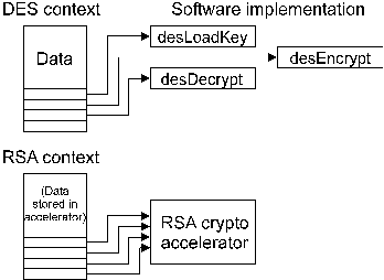 When the two objects are created, the DES context is plugged into the software DES implementation and the RSA context is plugged into a hardware RSA accelerator. Although the low-level implementations are very different, both are accessed through the same methods, typically context.loadKey(), context.encrypt(), and context.decrypt(). Substituting a different implementation of an encryption algorithm (or adding an entirely new algorithm) requires little more than creating the appropriate interface methods to allow a context to be plugged into the underlying implementation. As an example of how simple this can be, when the Skipjack algorithm was declassified [21] it took only a few minutes to plug in an implementation of the algorithm, providing full support for Skipjack throughout the entire architecture and to all applications which employed the architecture's standard capability query mechanism, which automatically establishes the available capabilities of the architecture on startup.