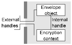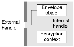 Figure 10. Encryption context internal structure 6.2. Object ReuseSince object handles are detached from the objects they are associated with, a single object can (provided its ACL's allow this) be used by multiple processes or threads at once. This flexibility is particularly important with objects used in connection with container objects, since replicating every object pushed into a container creates both unnecessary overhead and increases the chances of compromise of sensitive information if keys and other data are copied across to each newly created object. Instead of copying each object whenever it is reused, the architecture maintains a reference count for it and only copies it when necessary. In general the copying is only needed for some encryption contexts, which employ a copy-on-write mechanism which ensure the object isn't replicated unnecessarily. Other objects which can't (easily) be replicated, or which don't need to be replicated, have their reference count incremented when they are reused, and decremented when they are freed. The object itself is only destroyed when its reference count drops to zero. To see how this works, let's assume the user creates an encryption context and pushes it into an envelope object. This results in a context with a reference count of 2, with one external reference (by the user) and one internal reference (by the envelope object) as shown previously in Figure 8. Typically the user would then destroy the encryption context while continuing to use the envelope which it is now associated with. The reference with the external access ACL would be destroyed and the reference count decremented by one, leaving the object as shown in Figure 11 with a reference count of 1 and an internal access ACL.