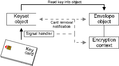 Figure 11. Objects with multiple references after the external reference is destroyed To the user the object has indeed been destroyed, since it is now accessible only to the envelope object. When the envelope object is destroyed the encryption context's reference count is again decremented through a message sent from the envelope, leaving it at zero whereupon the kernel sends it a "destroy object" message to notify it to shut itself down, after which it removes the object from the object table. The only time objects are explicitly destroyed is through an external signal such as a smart card withdrawal or when the kernel broadcasts destroy object messages when it is closing down. At any other time only their reference count is decremented. In some cases an object has to change its behaviour when it is reused. For example some key databases don't handle multiple independent writes at all well (this can upset their internal buffering and state management), so the object will change its ACL from read/write to read-only when its reference count becomes greater than one. Once it drops back to one, the ACL is updated to allow read/write access again. The use of the reference-counting implementation allows objects to be treated in a far more flexible manner than would otherwise be the case. For example the paradigm of pushing attributes and objects into envelopes (which could otherwise be prohibitively expensive due to the overhead of making a new copy of the object for each envelope) is rendered feasible since in general only a single copy of each object exists. Similarly, a single (heavyweight) connection to a key database can be shared across multiple threads or processes, an important factor in a number of client/server databases where a single client connection can consume a megabyte or more of memory. 6.3. Data Formats Since each object represents an abstract security concept, none of them are tied to a particular underlying data format or type. For example an envelope could output the result of its processing in the data format used by CMS/SMIME, PGP, PEM, MSP, or any other format required. As with the other object types, when the envelope object is created, its function pointers are set to encoding or decoding methods which handle the appropriate data formats. In addition to the variable, data format-specific processing functions, envelope and certificate objects employ data recognition routines which will automatically determine the format of input data (for example whether data is in CMS/SMIME or PGP format, or whether a certificate is a certificate request, certificate, PKCS #7 certificate chain, CRL, or other type of data) and set up the correct processing methods as appropriate. 7. Interobject Communications Objects communicate internally via a message-passing mechanism, although this is typically hidden from the user by a more conventional functional interface. The message-passing mechanism connects the objects indirectly, replacing pointers and direct function calls and is the fundamental mechanism used to implement the complete isolation of architecture internals from the outside world. Since the mechanism is anonymous, it reveals nothing about an objects implementation or its interface, or even its existence. The message-passing mechanism has three parts, the source object, the destination object, and the message dispatcher. In order to send a message from a source to a destination, the source object needs to know the target objects handle, but the target object has no knowledge of where a message came from unless the source explicitly informs it of this. All data communicated between the two is held in the message itself. To handle interobject messaging, the kernel contains a message dispatcher which maintains an internal message queue used to forward messages to the appropriate object or objects. Some messages are directed at a particular object (identified by the objects handle), others to an entire class of object or even to all objects. For example if an encryption context is instantiated from a smart card and the card is then withdrawn from the reader, the event handler for the keyset object associated with the reader broadcasts a card withdrawal message identifying the card which was removed to all active objects as illustrated in Figure 12. This is necessary to notify the encryption context that it may need to take action based on the card withdrawal, and also to notify further objects such as envelope objects and certificates which have been created or acted upon by the encryption context -- since the sender is completely disconnected from the receiver, it needs to broadcast the message to all objects to ensure that everything which might have an interest is notified. The message handler has been designed so that processing a message of this type has almost zero overhead compared to the complexity of tracking which message might apply to which objects, so it makes more sense to handle the notification as a broadcast rather than maintaining per-object lists of messages the object is interested in.