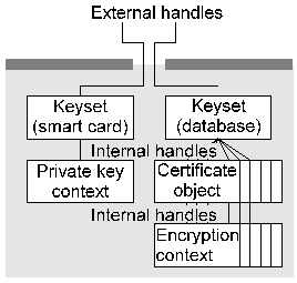 Figure 1. Typical low-level objects Container objects generally contain other objects (as well as data and attributes) within them. For example each certificate object has an (internal) public or private key context attached to it as shown in Figure 2.