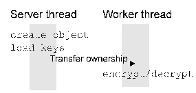 Figure 5. Object ownership transfer Operating at a much finer level of control than the object ACL is the discretionary access control (DACL) mechanism through which only certain capabilities in an object may be enabled. For example once an encryption context is established, it can be restricted to only allow basic data encryption and decryption, but not encrypted session key export. In this way a trusted server thread can hand the context off to a worker thread without having to worry about the worker thread exporting the session key contained within it. Similarly, a signature object can have a DACL set which allows it to perform only a single signature operation before it is automatically disabled by the security kernel, closing a rather troublesome security hole in which a crypto device such as a smart card can be used to authenticate arbitrary numbers of transactions by a rogue application. The usual way of implementing this fine level of control is to use a security attribute object containing the control information attached to an encryption context. Enforcement of finer-grained attribute-based DACL settings is handled by the object itself, since these settings are specific to each object type. ACL's are inherited across objects, so that retrieving a private key encryption object from a keyset container object will copy the container object's ACL across to the private key encryption object. 5.1. Object Security Implementation When an object is created, it is identified to the entity which requested its creation through an arbitrary handle, an integer value which has no connection to the objects data or associated code. The handle represents an entry in an internal object table which contains information such as a pointer to the objects data and ACL information for the object. Both the object table and the object data are protected through locking and ACL mechanisms. Creating a new object works as follows: