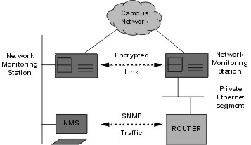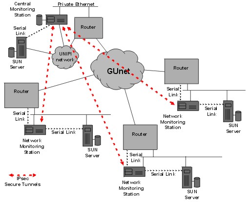 This agent allows serial ports to be accessed from other stations connected to the secure network. 4. Examples of useIn this section we give two examples of the use of the system we have just described. The first example describes the way this system is used within the University network to manage routers and other network elements, while the second example describes the use of this system to handle the communication of network management teams of GUnet, a network linking Greek Universities.4.1 Campus NetworkThe network monitoring stations have been deployed within the University of Piraeus network in three roles:Controller: the monitoring station is connected directly to a router or other network device (e.g. switch, access server, etc.) so that configuration and administration of the device is carried out through the secure network. These connections can be serial links connecting one of the station built-in serial ports to the router console. Logins to the network device through its network ports are disabled so that administration can be carried out only via the console port. Hosts with serial consoles (e.g. SUNs) can also be controlled in this way. An alternative means of connection is via back-to-back Ethernet links (see figure 2). In this case we dedicate an Ethernet port from the router and an Ethernet port from the network monitoring station and link them via a crossed UTP cable. Via appropriate configuration of the router (e.g. ACLs) we can make sure that logins are allowed only from that Ethernet port. Similarly SNMP traffic may also be directed to that port. The Network Monitoring Station then relays the SNMP traffic through the IPsec links to the NMS workstation.