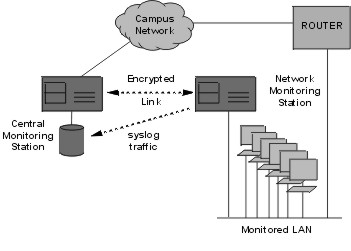 ![]() Figure 2: Patching external devices into the secure network.Traffic Monitor: We can monitor traffic on various LAN segments using tcpdump and send the output via syslogd to a central logging host. The syslog traffic goes over the IPsec links so that it cannot be intercepted (see figure 3)
