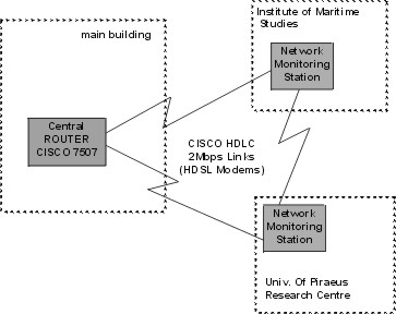 ![]() Figure 3: Monitoring remote parts of the LAN.Router: by adding high speed serial cards to the Network Monitoring Station we have created an emergency router for 2Mbps connections to buildings located outside the main campus and linked to the main building via leased lines (see figure 4). The OpenBSD kernel can support IP routing and through the addition of routing software (e.g. gated), it can exchange routing information (OSPF) with dedicated routers.
