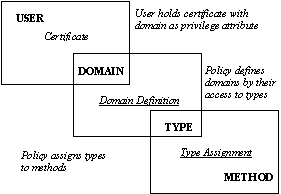 2.1 Domains, Roles, and Role AuthorizationOO-DTE has been designed to support role-based security policies, that is, policies that grant users access rights according to their assigned roles (duties) within an organization [NICO]. In our earlier DTE kernel operating systems, each role was represented as a collection of domains. This allowed each task initiated by a user to run as a separate process in a "small domain" providing only the minimum set of access rights needed to accomplish that task. This approach was developed in accordance with the principle of least privilege [SALT]. OO-DTE, however, is designed to run on mainstream operating systems whose kernels lack comparable process spawning and access control facilities. Consequently, in OO-DTE, each role is represented by a single domain; hence, the terms role and domain have become virtually synonymous.In OO-DTE, a user may be authorized for multiple roles, but each connection associated with a user process is bound to a single role (domain). OO-DTE roles can be constructed hierarchically by defining domains in terms of other domains, in the manner of Baldwin's Named Protection Domains [BALD]. OO-DTE does not provide facilities for dynamic or static separation of duty; unlike some practitioners [KUHN], we regard these as distinct from the fundamental aspects of role-based access control. Roles, domains, and types provide several levels of indirection in the authorization policy. As discussed later, users hold X.509 certificates that contain an OO-DTE domain as a privilege attribute. The policy defines domains in terms of their access rights to types. The policy also assigns types to methods. Through these levels of indirection, a user's authority to invoke a method can be determined. Figure 1 shows the relationships between users, domains, types, and methods: ![]() 3. DTEL++ Policy LanguageDTEL++ is the policy language used to specify OO-DTE security policies [TALL]. It is used to declare types, to assign a type to each method that might be invoked, and to define domains in terms of the types each domain can invoke or implement. We will motivate the discussion of the policy language by illustrating how it can be used to control a simple application system.3.1 Sample ApplicationSuppose we are writing an application to manage the books in a library. The primary objects in our application are librarians, patrons, and books. One can enter, remove, and find books in the card catalog, reserve books, and check books in and out. The Client-server interface for this application, as specified in CORBA's Interface Definition Language (IDL), might look like this:module Library {In our policy, we want to allow both librarians and patrons to find books in the card catalog and to reserve books. Additionally, we want to allow only librarians to check books in and out, to enter new books into the catalog, and to remove books from the catalog. 3.2 Type Definitions and Simple Type AssignmentsEvery DTEL++ policy must declare types. These types are then used to label interface methods so that access to the methods can be controlled. In our policy we declare two types, safe_t and restricted_t with the OO_type statement:OO_type safe_t, restricted_t;Methods that both patrons and librarians are allowed to invoke will be assigned the safe_t type, and methods that only librarians are allowed to invoke will be assigned restricted_t5. Each method in each interface must be assigned a type. This can happen in one of several ways. The most straightforward way is with an explicit assign statement for the method. Since patrons can safely be allowed to look up books in the catalog, the type safe_t is assigned to the method findByTitle() by the assign statement: assign safe_t findByTitle;A second way of assigning types to methods is to assign a default type to the methods within an interface or module, as in: assign restricted_t _DEFAULT;Each module and interface may be assigned a default type. By declaring a default type of restricted_t, any method that does not receive a type via an explicit assign statement, as shown previously, will receive the type restricted_t. This allows us to construct our policy so that patrons can invoke only those methods that have been explicitly granted to them. Other ways of implicitly assigning types will be discussed in Section