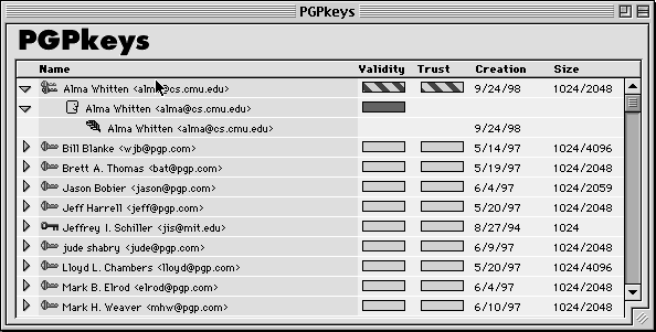 4.7 Too much information In previous implementations of PGP, the supporting functions for key management (creating key rings, collecting other people's keys, constructing a ``web of trust'') tended to overshadow PGP's simpler primary functions, signing and encryption. PGP 5.0 separates these functions into two applications: PGPKeys for key management, and PGPTools for signing and encryption. This cleans up what was previously a rather jumbled collection of primary and supporting functions, and gives the user a nice simple interface to the primary functions. We believe, however, that the PGPKeys application still presents the user with far too much information to make sense of, and that it needs to do a better job of distinguishing between basic, intermediate, and advanced levels of key management activity so as not to overwhelm its users. Currently, the PGPKeys display (see Figure 2) always shows the following information for each key on the user's key ring: owner's name, validity, trust level, creation date, and size. The key type is also indicated by the choice of icon, and the user can toggle the display of the signatures on each key. This is a lot of information, and there is nothing to help the user figure out which parts of the display are the most important to pay attention to. We think that this will cause users to fail to recognize data that is immediately relevant, such as the key type; that it will increase the chances that they will assign wrong interpretations to some of the data, such as trust and validity; and that it will add to making users feel overwhelmed and uncertain that they are managing their security successfully. We believe that, realistically, the vast majority of PGP's users will be moving from sending all of their email in plain text to using simple encryption when they email something sensitive, and that they will be inclined to trust all the keys they acquire, because they are looking for protection against eavesdroppers and not against the sort of attack that would try to trick them into using false keys. A better design of PGPKeys would have an initial display configuration that concentrated on giving the user the correct model of the relationship between public and private keys, the significance of key types, and a clear understanding of the functions for acquiring and distributing keys. Removing the validity, trust level, creation date and size from the display would free up screen area for this, and would help the user focus on understanding the basic model well. Some security experts may find the downplaying of this information alarming, but the goal here is to enable users who are inexperienced with cryptography to understand and begin to use the basics, and to prevent confusion or frustration that might lead them to use PGP incorrectly or not at all. A smaller set of more experienced users will probably care more about the trustworthiness of their keys; perhaps these users do have reason to believe that the contents of their email is valuable enough to be the target of a more sophisticated, planned attack, or perhaps they really do need to authenticate a digital signature as coming from a known real world entity. These users will need the information given by the signatures on each key. They may find the validity and trust labels useful for recording their assessments of those signatures, or they may prefer to glance at the actual signatures each time. It would be worthwhile to allow users to add the validity and trust labels to the display if they want to, and to provide easily accessible help for users who are transitioning to this more sophisticated level of use. But this would only make sense if the automatic derivation of validity by PGP's built-in policy were turned off for these users, for the reasons discussed in Section 4.4. Key size is really only relevant to those who actually fear a cryptographic