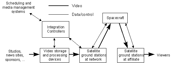 GEnesis is an upgrade to the NBC television network to support the requirement for digital video and to increase the network’s capacity from ten simultaneous streams of video to forty. It is an ambitious control system; it includes roughly 400 computer-controlled devices for processing, storing, and routing video. Among its components are some sixty devices for video storage and processing that include RAID arrays totaling several tens of terabytes of disk space, satellite uplink/downlink controls at over two hundred stations, and high-bandwidth digital video routers to interconnect the devices. The system does not run production studios nor transmitters at the local stations, but handles all the tasks needed in between: video storage and playback, combining video segments into an integrated stream, adding special effects, doing voice-overs, and managing the satellite distribution system for over 200 NBC affiliate stations. An overview of the system appears in Figure 1.