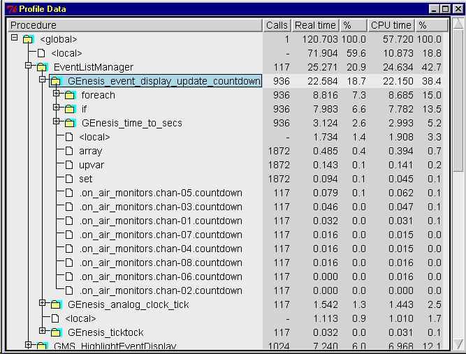 Finally, in desperation, we implemented our own data reduction atop the NeoSoft profiler. Our system (Figure 6) uses the hierarchical list widget in Tix [LAM95] to display the call tree, and shows the real and CPU time spent in the procedure, and in the procedure plus descendants, next to the procedure’s entry. Browsing through the output in this form makes the trouble spots obvious. (It would still be nice to tie them to source file and line number. We hope that the forthcoming TclPro product will finally make it possible.)