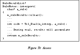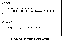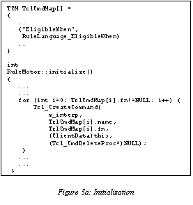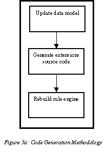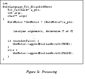 There are some other worthwhile observations to make about the effect of the language metamorphosis. These included the number of commands in the language: it did require more work on the author's part to know what the categories of commands were. However, we felt that this was not unusual for a scripting language. Also, many of the command names were predictable. Another related, but subtler, aspect was the level of redundancy in the new language. Recall that we had to process several types of rules: eligibility, costs, credits, dates of effectivity, etc. Now, while there were close to 10 types of rules to deal with, we were always returning a single result, the type of which was either boolean, double, or date. This implies that we really only needed three distinct commands for returning rule results. While critics might lobby for one mechanism for returning a type of double, there was an obvious subtle benefit to having distinct commands on a rule type basis: increased language transparency. For example, we were freer to update the semantics of eligibility instead of forever remaining tied to the notion that it only represented either True or False. By making these changes to the rule language, we improved the performance of rule interpretation, decreased the potential for error, and hid the ugliness of data typing. Most importantly, from the authoring point of view, the rules were much easier to read and understand. This, in turn, made them easier to author. 4.2.3 Rule Concepts: Dynamic ExtensionsIt is often desirable to customize a language to best meet the specific needs of a client. Each company has its own way of doing business, its own business logic concepts, which frequently play a role in rule processing. Our goal was to do what was possible to support the expression of rules in these simple, familiar terms, to improve the usability of the rule language, as well as to promote rule compactness. Our solution was to support the declaration of rule concepts, company-specific extensions to the rule language. In this sense, the rule language was thus a union between the base language and the concepts for a given company. In practice, rule concepts were simply macros to facilitate the simple expression of a awkward or complex computation. Suppose a company is based in California and frequently uses the state tax rate in their benefit plan cost rules. They might want to express a cost rule as something on the order of: "the cost of this plan is $200 plus 1% of the employee's salary multiplied by the state tax rate". We might want to capture "tax rate" as a concept. To do this, they would use our administration interface to name a new language command called TaxRate and define its meaning. Optionally, if the phrase "one percent of <some number> times the tax rate" was a frequently used computation, the company could even define that as a concept (i.e., OnePercentAndTaxOf),The benefits of rule concepts are three-fold: they provide a key level of functional abstraction in the language, they increase the re-usability of rule code in the system, and they also allow us to personalize Tcl to best address the specific business language of our clients. 5 Language IntegrationThe new version of our rule language was also notable in terms of the issues it raised related to system integration. Some of these had to do with the management of having over 150 Tcl extensions, specifically in terms of proper maintenance and namespace clashing. Other issues involved the relationship of the language to the application data model and how useful application-level data objects might be represented . 5.1 Automating Generation of Tcl ExtensionsWith over 100 commands for data access alone, there was concern about the ability to manage the development of these extensions without assigning more programming staff to the task. Since the nature of all of these extensions were the same (retrieve data, optionally provide comparison logic), we decided to spend time developing a mechanism for automatically generating the code for these extensions. Our process for this is shown in Figure 5a. The typical cycle of development was to first update the data model as required, export the associated data definition language (DDL) to a file, use the DDL to the automatically generate source code for the Tcl extensions, and finally rebuild the extensions library. This level of automation allowed us to efficiently adapt the data model as required. In fact, DDL revisions became a far more problematic issue for the applications themselves (which often referred to attributes and tables literally) than it was for the rule engine. ![]() 5.2 Naming Issues One additional issue we encountered was that of the command namespace management. For example, all of the tables which could be data access candidates in rules contained attributes which were named the same, but included in different tables for various reasons (they were foreign keys or just deliberate duplicates of information for purposes of security via data partitioning). What this meant, for example, was that we could have a field in the demographic table called " Birth_Date" and a field in the employment information table called "Birth_Date". We needed to mechanism to establish closure [Neuman89], to ensure name uniqueness.We took the common route of prepending a unique (table-based) prefix to each command. Thus, a rule for comparing birth dates would appear as: if [ EmpAge == [BenAge] ] then ... ... This would compare the age of the subscriber as listed in the employment ( Emp) information with the age of the subscriber in the benefits (Ben) table.There is additional naming complexity when considering how to deal with implementing rule concepts. For example, if two companies want to create a concept called ComputeTax, how should this be resolved? Should the company who first requested this concept be awarded the right to name it? More alarming was the privacy aspect of concepts: