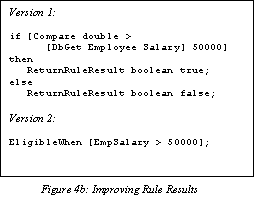 For example, consider the problems with comparing two dates - the subscriber's hire date at the company and his birth date. Although we would want to say: if [Compare LessThan [DbGet Subscriber BirthDate] [DbGet Subscriber HireDate] ] then ... endif this would be problematic unless the type information was included: if [Compare date LessThan [DbGet Subscriber BirthDate] [DbGet Subscriber HireDate] ] then ... endif These issues are representative of those associated with implementing the other generic extensions we did in our initial language definition. We found that they placed a heavy burden on the rule author, they are far more prone to error, they incurred greater parsing demands, and they were overly verbose. Perhaps the greatest crime was that rule author, the most valued client of all, was presented with an ambiguous, cumbersome interface. Despite all of these problems, there was one important benefit to our initial version of the language: the speed at which we could implement a functioning rule processor. The rule engine became one of the first modules of the alpha portion of the application software to actually work. This milestone allowed the engineering team to focus more on system integration issues and re-assign developers to other projects which were not yet completed. Additionally, it allowed us to begin coding rules for some of our initial clients. 4.2 Take Two: The Final CutWith proof of concept under our belt, the second version of Benefit Manager saw us revisit the design of the rule language. By this point in our development, we were now made clearly aware of the problems associated with implementing generic commands. For the second release, we wanted less verbose rules, less parsing, decreased burden on the rule author to understand various uses of the same command, and a syntax which generally left fewer opportunities for user error. 4.2.1 Improving Data AccessEarly in the process, we attained a major milestone by developing a new paradigm for data retrieval. Our approach was to create a Tcl extension for every possible attribute of every table in our retrieval domain. The name of these commands was the concatenation of the table and attribute for that item. Implementing each potential retrieval as an extension also gave us the opportunity to hide the data typing associated with that item. For every database command, our rule language supported two styles of execution. In the first, no arguments were specified and the string (typeless) value of the attribute was resolved. The second form required comparison arguments and returned either true or false, depending on the result of the comparison. It was this second form of data access and comparison which gave us the opportunity to implement automatic datatyping. Figure 4a shows the how a rule based on subscriber salary would be authored in the first and second versions of the rule language. Obviously, the second version is more compact, less cluttered, incurs less runtime parsing, and makes the data typing automatic and transparent. ![]() 4.2.2 Improving Rule Result Reporting Another major language improvement was to make rule result reporting easier. As was the case with data access, the first version of the rule language placed the burden of declaring the rule result type in the hands of the author. Even more concerning was that authors might forget to return a result (leaving the application confused about the status of rule satisfaction) and the high potential that certain control flows might not lead to any results being reported. To address these issues, we devised specific styles of commands which would encourage full reporting. The heart of the problem was the reliance on IF-THEN logic. Such logic was characteristic of most rules and we attempted to implicitly capture that logic in our new commands, improving code compactness and removing some of the potential for coding errors.Figure 4b shows how an benefit eligibility rule appears in both versions of the language. Obviously, the first version contains more code and places a higher degree of responsibility on the author in terms of control flow checking. The second version makes the IF-THEN logic implicit in the EligibleWhen command. This command simply takes a space delimited list of values and returns false (i.e., "not eligible") if any of these values are zero.![]()