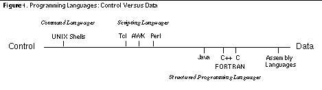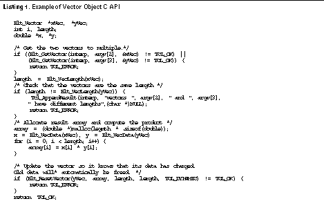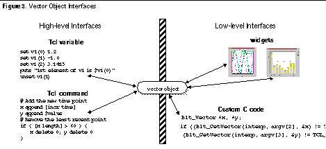 George A. Howlett AbstractScripting languages are great for gluing together components, but they suffer as the complexity or size of data scales upward. Data objects solve this problem by marrying both high-level and low-level programming styles. Data objects are self-contained representations of data. They define both the structure of the data and the methods to access it. Data may be accessed through both Tcl and a C interface. This paper will describe two such data objects, a vector and table object. IntroductionScripting languages such as Tcl See J. K. Ousterhout, Tcl: An Embeddable Command Language, Proceedings of the 1990 Winter USENIX Conference, 1990, pp. 133-146. , have been described as fundamentally changing the way people write programs, representing a very different style of programming See J. K. Ousterhout, "Scripting: Higher-Level Programming for the 21st Century", Computer, March 1998, pp. 23-30. . They let developers rapidly form new applications from components and pieces of existing applications. What distinguishes scripting languages from conventional structured programming languages (e.g. C, C++, FORTRAN) is that they are high-level, interpreted, and weakly typed. Despite their advantages, scripting languages do not replace structured programming languages. They, in fact, offer a very different set of trade-offs. Where Scripting Languages SucceedScripting languages make it easy for programmers to control how components are used. Because programming is done at a high-level, components have simple interfaces. Components are identified by strings, not pointer addresses. Even heterogeneous components can be referenced and grouped by a simple list of names. Components also have well-defined operations that can be used to access or modify their internal data without requiring an understanding of how the data is structured. Scripting languages are usually interpreted, so the flow of program execution is simple to change and test. It's easy to wire applications together quickly or try out new algorithms. A good example of high-level components is the Tk widgets. Widgets are referenced by string identifiers. They have well-defined configure and cget operations that change widget attributes. (You can change a widget's font without knowing anything about the structure of a Tk font). It's easy to rearrange widgets or add and test new behaviors using the bind command. Where Scripting Languages FailScripting languages are inversely weak where structured programming languages are strong. As an application's data scales from tens to thousands of elements, scripting languages perform worse than compiled low-level languages. Both in terms of performance and memory utilization, scripting languages carry greater overhead. For example, a simple array of 10,000 elements in Tcl will use as much memory to store the indices as the values. Arrays in C have no such overhead. Flexibility has a cost. Weak typing requires that data many times be converted back-and-forth from strings to native machine types (e.g. ints, doubles). For example, the time to plot a graph of 10,000 data points is dominated by the string-to-decimal conversions, not the performance of the X server. Scripting languages lack facilities for structuring and manipulating complex data. They are, by definition high-level. You can not easily define new data types, access pointers, or manage native types. Side-effects of weak data structuring can be seen in Tk. Widgets often get used as data containers. For example, string data is sometimes put into a text widget just to use its more powerful search and replace operations. Data also becomes tightly coupled to widgets. Let's say you are displaying file directory information in a listbox widget. You may also maintain several Tcl arrays for various information fields (owner, date, size, etc.) other than the file name. Each of these data containers must be synchronized. If entries are inserted or deleted or the listbox is itself destroyed, the other data containers must be likewise updated. Program control becomes increasingly complex and error prone as more parallel data structures are required. What Makes a Language High Level?It is usually in terms of data where scripting languages fail. In applications data can scale much more quickly than code size, sometimes by several magnitudes. High level data abstractions preclude fine-grain access to data. Furthermore, the overhead of weak typing both increases memory consumption and slows data processing. Consider programming languages in terms of how finely or coarsely they handle data. Figure 1. shows a continuum from high-level command languages to low-level structured programming languages. High level languages abstract data to remove details, making control very simple. Structured programming languages provide a very fine-grain control of data. Conversely, control is complicated by the details and complexity of the data representations. ![]() Data ObjectsTcl was originally designed to be extensible, allowing you to link your own C code to extend the language by adding new commands and variables. We can use this feature to represent data at both programming levels, as data objects. Data objects are simply containers for data. They are objects because each instance represents both a set of data and high-level operations for querying and modifying that data 1 . Programming at Both LevelsAt the Tcl programming level, a data object is referenced by its string identifier. Objects can be shared simply by passing their names. Object data is accessed or changed through a collection of well-known operations. Because data operations are written in C code, operations for data objects run as fast as compiled code. Data objects also provide a low-level programming interface. An object's data can be accessed directly from its C API, without going through Tcl or converting the data from a string. For example, widgets may use this interface to access 