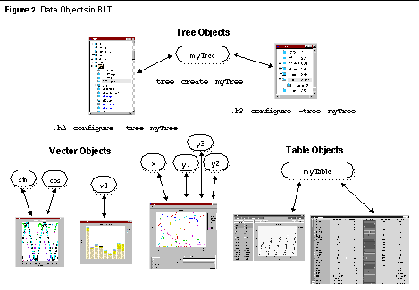 d0 row select { IBL == 3.0 } Since data objects are easily connected to widgets, the new parameters are automatically displayed in a table widget. The parameter fits are plotted in the graph widget. The table objects act as a go-between to the high and low-level programming worlds. Like many applications, Camelot benefits from working at both levels. ConclusionData objects act as basic application building blocks. The high-level Tcl interface allows large numbers of objects to managed easily. Built-in operations let the user accomplish most data transformations from the Tcl level. The C level interface allows specialized code to be performed by revealing the object's internal data. Two examples of data objects are vectors and tables. They both represent common data structures for many applications. The idea or utility of these objects is nothing new. Interactive statistical programming languages such as S See R. A. Becker, J. M. Chambers, A. R. Wilks, The New S Language, Wadsworth & Brooks/Cole, Pacific, CA. 1988. or MATLAB have demonstrated the power of vector and matrix programming for many years. What is new is how these objects can be applied to very high-level languages such as Tcl to solve a wide class of performance problems and to simplify interactions with data. Several questions remain open. What are the standard data objects? What like of low-level API is required? Is a better object system, such as [incr Tcl] required? The hope is that if a set of objects becomes ubiquitous, it will form the basis for large plug-able components. These components would in turn become the building blocks for greater applications. References