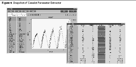proc calc { list1 op list2 } { Each test was run using an increasing number of values. The time (in seconds) for each test is listed below. The improvement of (byte-compiled) Tcl 8.0 over Tcl 7.6 is striking. Not surprisingly though, vectors out perform both the byte-compiled and non-compiled versions of Tcl using lists 2 . Vector operations written in C code will generally have less overhead than byte-compiled code. For vector.tcl , the read in and string-to-decimal conversions were the greatest portion of the time spent, not the arithmetic. Application: Parameter ExtractorA parameter extractor compares the behavior of a model of an IC circuit to measured results from real devices. A model is a set of equations (written in a structured programming language like C or FORTRAN) that given input voltages, returns an output current. Models also have parameters, such as temperature and device size, that affect its calculations. The job of a parameter extractor is to evaluate the model of a circuit repetitively, bumping parameter values up and down in a way that minimizes the error between the model's outputs and measured data. The end product is a set of model parameters that best reflect the real devices. This a computationally hard task. There can be thousands of measured data points. Models can have scores of parameters, allowing many degrees of freedom. Complex or over-parameterized models may exhibit multiple local minima. One method to stabilize the extraction process is to limit the number of the parameters that can be altered. It may also be desirable to constrain the parameters to lie in certain ranges (e.g. a resistance must be positive). How one selects initial parameter values, their constraints, and representative data regions matter greatly. High-level Programming?Such compute-intensive tasks are usually the domain of low-level structured programming languages. The extraction step requires speed and numeric precision. But data selection and filtering is an equally important aspect of the application. The extractor must manage the various inputs (voltage, temperature, etc.) and the outputs (currents returned from a particular circuit). Additionally the model parameters must also be coordinated. Scripting languages are better at controlling how and where data is used. For parameter extraction, this is especially useful to experiment with different heuristics or wire in new models. The Camelot parameter extractor developed at Bell Laboratories, lives in both programming worlds. Figure 4. shows a snapshot of the application. The currency of the application is a table data object. ![]() The table data object represents a dynamically resize-able table of values. Rows and columns of the table can be selected, sorted, duplicated, etc. Each row and column has its own label and can be used just as a vector. For example, you can plot different columns of values. The code below creates a new table object d0. A new Tcl command d0 is also created that can be used to access the table of data from Tcl. Table objects have several generic operations. The read operation reads tabular ASCII data from a file into the object. The column extend operation adds a new column to the table. The column label operation sets the label for columns.