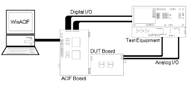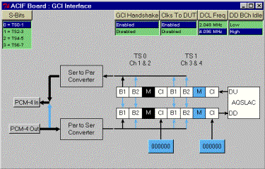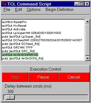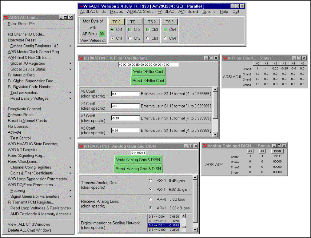 WinACIF is a 32-bit Windows application we designed to support AMD's SLAC Ô family of integrated circuits. Telecommunications equipment manufacturers use the SLAC (Subscriber Line Audio-Processing Circuit) family of ICs to build telephony linecards that interface analog telephones with digitally switched networks. WinACIF users include AMD’s engineering staff and customers. Using Tcl/Tk, we created a GUI that provides a readily understood and convenient means of programming the hundreds of features contained in the SLAC IC and displaying their current state. We utilized Tcl in conjunction with our application-specific extensions (implemented in C and C++) to script interactions with the IC. The application also configures and controls an interface board that generates and coordinates digital signals between the SLAC device and PC, and between the device and test equipment (Figure 1). Tk’s canvas widget provides a handy way to build a dynamically configurable diagram that depicts the signal flow in a manner familiar to the users.Figure 1. WinACIF lab bench schemeAMD’s SLAC devices are programmable codec/filter ICs. They are essentially embedded digital signal processors that perform A/D conversion, D/A conversion, filtering, compression and expansion functions. With the advent of AMD’s advanced SLAC devices, the programmability now extends to control the line power feed, ringing, signaling and test functions. This programmability benefits the linecard designer by providing the flexibility to create one hardware design that satisfies the diverse requirements of multiple markets. This flexibility, in turn, benefits the telecommunication systems manufacturer by streamlining the manufacturing process and by reducing inventory, administrative costs and time required to address new markets.The cost of all this flexibility is complexity. The most recent member of the SLAC product family has over 115 programmable command op-codes. Each op-code may be associated with a register containing up to 14 bytes of data. The data bytes themselves may contain multiple bit fields of varying widths, each controlling some programmable operating parameter of the device. The engineer involved in the debug or application of the SLAC device faces a formidable testing and characterization task. This is particularly true when the design is intended to meet the requirements of several markets having diverse specifications. A great deal of lab bench experimentation and verification is required to ensure that the design meets the needs of all the targeted markets. WinACIF and its associated hardware provide a turn key evaluation platform that allows interactive manipulation of all the programmable features of the SLAC devices. This platform allows the engineer to easily explore the multiple "what if" scenarios inherent in linecard design. The development efforts of AMD’s customers are streamlined and time to market minimized by having a tool that allows them to immediately begin evaluation of the SLAC device. They can begin the design of their application circuit and establish the proper SLAC device programming for their application without making an investment in building evaluation hardware. WinACIF is often used in conjunction with WinSLAC. WinSLAC, a design synthesis tool, accepts the linecard design specifications and design constraints as input and produces an output text file containing the information required to configure the programmable filters of the SLAC device. WinACIF includes Tcl commands that convert this information into a stream of commands that will program the data into the SLAC device. Previously, we constructed support tools with the National Instruments’ LabWindows Ò program under MS-DOS, adding C code to provide callback functionality. This implementation suffered from the following limitations:The ability to extend Tcl with introspective commands written in C allowed us to realize our primary design goal of generalizing the ACIF software to support multiple devices having diverse interfaces. The main Tcl script, acif.tcl, loads the core of the application, acif.dll. Acif.dll includes a data store comprised of arrays of C structures that contain the programming command sets for each of the SLAC devices. After loading acif.dll, the Tcl script uses one of the new commands, acifProducts, to ask the data store to return a list of available products. The Tcl script uses this list to construct an array of radiobuttons from which the user selects a product name. Upon selection acifProducts is executed again, this time with the chosen name as an argument. This execution configures pointers in the underlying C code, so that subsequent operations reference the appropriate section of the data store. Throughout the program, we used this strategy of dynamically creating the GUI based on data obtained from the underlying data store. Depending on the argument sent with the command, our Tcl commands either return configuration information from the data store, or perform some related operation, such as writing or reading from the SLAC device. This structure made possible the writing of generic Tcl code that created different GUI’s depending on the information in the data store. In addition to acif.dll, the application may load one of several other DLL’s, depending on the options selected. For example, the SLAC devices have a variety of hardware interfaces. Some new devices even offer the choice between two interfaces. Downloading a different configuration file into the FPGAs (Field Programmable Gate Arrays) on the ACIF board redefines the interface logic. Acif.dll reconfigures the software by unloading the old driver DLL and loading the one that supports the new configuration. The new driver DLL defines new Tcl commands that control the interface logic implemented in the FPGAs. The various DLL’s and the application-specific Tcl commands they provide are summarized in Appendix A. To make our 