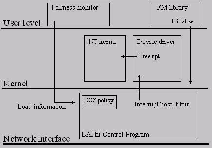 2.2. Implementation We implemented DCS for Windows NT 4.0 for the Intel x86 family of CPUs. Our implementation for Windows NT consists of four distinct parts: a DCS-aware Myrinet driver, the Fast Messages user-level library, a Fairness monitor, and DCS-aware FM firmware (a "LANai Control Program", or LCP) that runs on Myrinet card. These elements interact as shown in Figure 1. The Fairness monitor in combination with the device driver monitors thread scheduling in the system, the modified firmware uses this information to decide whether to preempt the current thread, and the modified device driver induces the kernel scheduler to choose the desired thread for DCS.