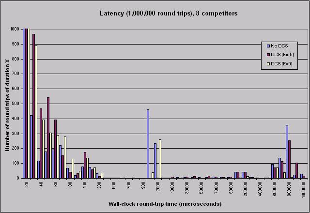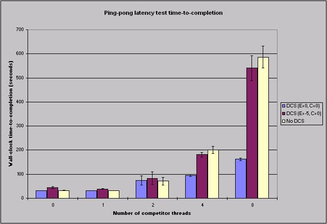 3. Performance Results We have implemented DCS for Windows NT 4.0 on a cluster of dual-processor Micron brand Pentium Pro machines running at 200 MHz, each with 64 MB of physical memory. Each machine contains a Myrinet PCI interface connected to a Myrinet switch. Our experimental methodology was as follows: We ran trials of FM’s latency benchmark along with zero, one, two, four, and eight CPU-bound competitor threads, passing one million packets on a round trip between a sender and receiver node. We ran ten runs of this test. Each trial reported a histogram of round-trip times in microseconds. We computed the mean value of each bin for each number of competing threads over the ten trials to get the results we report here. Preliminary results show that DCS improves performance, but that balancing fairness with performance is a tradeoff. We ran a ping-pong latency microbenchmark and a barrier benchmark on a cluster of six dual-processor 200 MHz Pentium Pro machines. Malfunctions in our LANai development tools prevent us from reporting the results of the barrier series here. Figure 2 shows the wall-clock time-to-completion for FM’s latency test with DCS enabled using E=0 and E=-5 and with DCS disabled. Our testing has indicated that for a large number n of compute-bound competitor threads, say four, the NT Server scheduler is fair; that is, we observe each competing thread to receive 1/n of the system. For four or more competitors, Figure 2 shows DCS with E=-5 to exhibit behavior similar to that of the NT scheduler alone. Since the latency test measures the wall-clock round-trip time required for a series of messages (in this case, one million), the time required for the entire test to run is an indicator of the average round-trip latency observed. Figure 3 shows the distribution of round-trip times for the eight-competitor case. The graph illustrates the large contributions that round-trip times as large as 1 second make to the latency benchmark’s time to completion as the number of competitor threads grows. Most of the contribution that the aggressive DCS configuration (E=0) makes to time to completion is clustered on the left side of the graph; non-DCS and the more passive DCS configuration (E=-5) show substantial numbers of round trips that last longer than 2 ms to total time to completion. The average latencies for the non-DCS and passive DCS cases swamp the average latency reported in the aggressive DCS case. Figure 2. Latency test time-to-completion