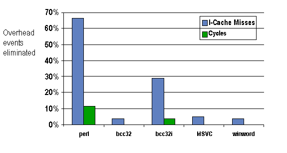 2.2 Optimization Etch also provides facilities for rewriting an executable in order to improve its performance. For example, it is possible to reorder instructions to optimize code layout for cache and VM behavior. Figure 4: The performance impact of code layout optimization. Figure 4 shows the reduction in instruction cache misses and execution time (in cycles) for a collection of popular Win32 programs that have been optimized for code layout using Etch on a 90Mhz Pentium. Etch was first used to discover the programs' locality while executing against a training input, and then to rewrite the applications, in order to achieve a tighter cache and VM packing. Infrequently executed basic blocks were moved out of line, and frequently interacting blocks were laid out contiguously in the executable, using an algorithm based on Pettis and Hansen [Pettis & Hansen 1990]. The results were measured using hardware performance counters. Different inputs were used for training and testing.