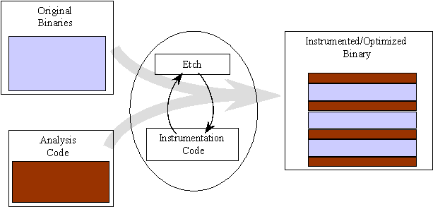 4 Summary Etch is a general binary rewriting tool for Win32 executables running on Intel architectures. Its key features are a generalized API that allows tools to be developed relatively quickly and run with relatively good performance. To learn more about the Etch project, or to obtain a version of this paper with color figures, please visit: http://www.cs.washington.edu/homes/bershad/etchFor traces generated from a few popular Win32 programs on the x86, visit: http://etch.eecs.harvard.edu/traces/index.htmlReferences [Chow et al. 1986] Fred Chow, A. M. Himelstein, Earl Killian and L. Weber, `"Engineering a RISC Compiler System," IEEE COMPCON, March 1986. [Eggers et al. 1990] S. Eggers, D. Keppel, E. Koldinger and H. Levy, "Techniques for Efficient Inline Tracing on a Shared Memory Multiprocessor," Proceedings of the ACM Conference on Measurement and Modeling of Systems, May 1990. [Graham et al. 1983] S. Graham, P. Kessler, and M. McKusick. "An Execution Profiler for Modular Programs," Software - Practice and Experience, 13, pp. 671-685, 1983. [Larus & Schnarr 1995] James R. Larus and Eric Schnarr, "EEL: Machine-Independent Executable Editing", Proceedings of the 1995 ACM SIGPLAN Conference on Programming Languages Design and Impelementation (PLDI), June 1995. [Pettis & Hansen 1990] Karl Pettis and Robert Hansen, "Profile-Guided Code Positioning", Proceedings of the 1990 ACM SIGPLAN Conference on Programming Language Design and Implementation (PLDI), June 1990. [Pietrek 1994] Matt Pietrek, "Peering Inside PE: A Tour of the Win32 Portable Executable Format", Microsoft Systems Journal, Vol. 9, No. 3, pg 15-34, March 1994. [Srivastava & Eustace 1994] A. Srivastava and A. Eustace. "ATOM: A System for Building Customized Program Analysis Tools," Proceedings of the 1994 ACM SIGPLAN Conference on Programming Language Design and Implementation (PLDI), June 1994. See also DEC WRL Research Report 94/2. [TracePoint 97]