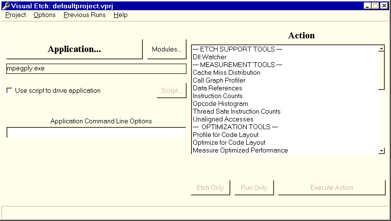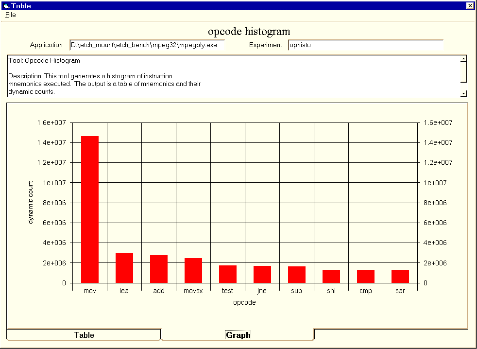 3 Using Tools Written With Etch There are three basic ways to use tools developed with Etch: one-at-a-time by hand; using a GUI; or through a tool-specific wrapper from the command line. The first, and most primitive, is to simply invoke Etch for each component in a program, passing in as an argument the name of the tool and the program component. For complex programs, this can be somewhat tedious and error prone, as it is necessary to specify each program component one at a time. Figure 6: The Visual Etch user interface. The second and more convenient way to run Etch is to use a graphical user interface. The Etch GUI (Visual Etch) makes a standard collection of tools available to Etch users without requiring that they write or understand the mechanics of building Etch tools. Our goal in developing the GUI was to make it extremely easy for the naïve user (such as an undergraduate programmer in an architecture course) to be able to run sophisticated experiments on commercial software. As such, it very much follows the "point, click, and go" model of control as illustrated by Figure 6. The user simply specifies a program and a tool, runs the program as modified by the tool, and then looks at the output. Figure 7: Sample results showing distribution of instruction opcodes. The user interface determines all of the program components, drives the rewriting process and ensures that whatever environment (e.g., working directory, data files, etc.) was initially available to the original executable is available to the transformed executable at run time. The GUI first runs Etch on the original binary to produce a new binary that has been modified to collect the necessary data. It executes the modified binary to produce the data, and feeds the data to analysis tools that produce graphs or charts that illustrate behavior or pinpoint problems. For example, Figure 7 shows the output from an opcode histogram tool that displays the distribution of instruction types for an MPEG player. If Etch is being used to optimize performance, the user may instruct Etch to apply a performance-optimization transformation. For example, Etch may rewrite the original binary to change the layout of data or code in order to improve cache or virtual memory performance, as was illustrated in Figure 4. The third way to run Etch is by using a command line version of the instrumentation front end. Our command line front end is based on a generic wrapper program that is specialized at compile time to the specific instrumentation tool with which it will be used. For example, we compile the wrapper along with the CGProf libraries to build the program CGInstrument. CGInstrument can then be used to instrument applications for call-graph profiling. Once instrumented, the profiled application can be run, and then another command, CGProfile , is used to post-process the raw profile information. For example, the sequence of commands to instrument and profile notepad.exe would be: C:> cginstrument notepad.exe C:> notepad-cgprof.exe C:> cgprofile notepad.exe The first step takes the original program (in this case notepad.exe) and all of its DLLs and produces versions that have been transformed to collect profile information. The second step runs the transformed version of the program (and uses all of the transformed DLLs), calling into the run time analysis routines to generate an output file containing profile information. Finally, the third step converts this output file into human-readable text. The CGProf command line interface makes it possible to include profiling with CGProf as a part of an automated build/test environment, rather than requiring interaction with a GUI. The CGProf command line interface manages the discovery and instrumentation of all the modules used by an application. It can watch the application during a training run to build the entire list of modules used by the application for a specific test and make the list available to the instrumentation process. Alternatively, new modules can be detected and instrumented while the profiling experiment runs. This makes it possible to eliminate the training run, and to accommodate slight variations in testing runs that cause new DLLs to be loaded.