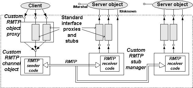 Introduction Due to the wide availability of the Internet and intranets, the use of multicast applications, such as document sharing, collaborative groupware and multimedia delivery, has grown quickly. Another trend in software development is rapid application development by using off-the-shelf components. Microsoft Component Object Model (COM) [COM 95] has become a popular paradigm for fast component integration. In this paper, we extend the COM object model to integrate with a multicast transport protocol, called RMTP [Paul 96]. The goal is to develop a framework that enables building multicast applications from off-the-shelf components. We demonstrate our initial results with a stock quotes dissemination system.COM over RMTP RMTP is built upon the foundation of IP multicast, and provides sequenced, lossless delivery of a data stream from one sender to a group of receivers. There is little correlation among the group of RMTP receivers. The Internet Group Management Protocol (IGMP) establishes a way of joining and leaving multicast groups. RMTP has been used commercially for data dissemination in wide area network where strong state consistency among the receivers is not required. COM specifies an architecture, a binary standard, and a supporting infrastructure for building, using, and evolving component-based applications. It extends the benefits of object-oriented programming such as encapsulation, polymorphism, and software reuse to a dynamic and cross-process setting. The overall architecture of COM+RMTP is shown in the figure. We leverage many mechanisms from the Distributed COM (DCOM) [Brown 96] technologies. DCOM is an object-oriented RPC protocol. It provides the infrastructure that allows a client process to create server objects on remote machines and to invoke their methods in a location-transparent way. While the standard DCOM implementation is designed for one-to-one, synchronous invocation, RMTP is used for one-to-many, asynchronous invocation. By encapsulating such semantic difference in the channel and stub manager components (see figure), we are able to implement our system by exploiting the DCOM custom marshaling mechanism to replace the RPC transport with the RMTP protocol, while reusing standard proxy/stub components provided by DCOM for data marshaling.An Application We use the COM/RMTP integration to implement a stock quote dissemination system. A client gets the stock quote from the Internet and makes COM method calls to multicast the data to a display component running on many (server) machines. The client and the servers communicate through a well-defined COM interface. It is interesting to note that, as we added more types of data to be delivered, new client and a new interface in the server were built to accommodate the changes without breaking old clients. Research Issues There are several issues to be addressed in order to make this framework practical: (1) a protocol to advertise a group and its COM interfaces, (2) a mechanism to handle multiple callbacks if servers need to notify the client, and (3) a tool to automate the development of multicast-aware components. We are currently working on these issues and exploring potential applications. References: [Paul 96] J. C. Lin and S. Paul , "RMTP: A Reliable Multicast Transport Protocol", INFOCOM '96, pp. 1414-1424, https://www.bell-labs.com/project/e-cast/rms_resource.html.[COM 95] The Component Object Model Specification, https://www.microsoft.com/oledev/olecom/title.htm[Brown 96] N. Brown, C. Kindel, Distributed Component Object Model Protocol -- DCOM/1.0, https://premium.microsoft.com/msdn/library/techart/msdn_dcomprot.htm