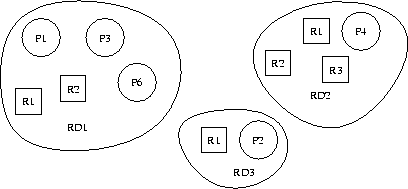 Reservation DomainsIn order to incorporate QoS into operating systems, we introduce the notion of a reservation domain. A reservation domain is a collection of processes and corresponding resource reservations. A computer system may run several reservation domains and provide several types of resources (e.g., CPU, disk, network, physical memory), which are reserved and scheduled independently. The processes that belong to a particular reservation domain are guaranteed to receive at least their reserved portions of the domain's associated resources. Figure 1 illustrates a system that runs three reservations domains: RD1, RD2 and RD3. Each domain contains an explicit resource reservation for the resources R1, R2 and R3. One or more processes may run within a single reservation domain.