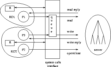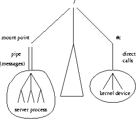 The implementation of I/O scheduling is closely related to the structure of Eclipse/Plan9 name space, as illustrated in Figure 7. The name space is formed by joining independent hierarchies of files, which are provided by file servers and kernel devices. File servers are user level processes, which respond to 9P requests over bi-directional pipes. Kernel drivers are directly called by the kernel, which avoids the 9P protocol overhead. Only a part of the name space may be subject to I/O scheduling, according to a flag in the mount and bind system calls. All other parts of the name space are not affected by I/O scheduling. This is essential, since all resources in Eclipse are part of the name space. For example, it is inappropriate to schedule requests to screen and mouse. Moreover, an attempt to schedule paging requests may cause a deadlock.