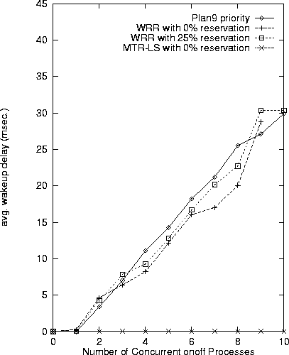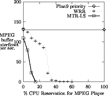 Figures 9 and 10 show the average number of buffer underflows in the MPEG card (which indicate missed deadlines). Buffer underflows are sampled at a 200Hz rate. A zero value indicates no missed deadlines, and it is always achieved when the MPEG player is running in an otherwise idle system. The value 200 indicates that all deadlines were missed (the buffer underflowed continuously). This experiment demonstrates that reservation domains provide guaranteed execution rate in an overloaded system. Both MTR-LS and WRR provided good quality of service under CPU load. However, MTR-LS required a reservation of 15% to prevent underflows, while WRR required a reservation of 55%. The reason for MTR-LS superiority is that it prefers less greedy processes, such as the MPEG player, over more greedy processes, such as onoff, which exhausted its entire reservation. Note that each onoff consumes more than 60% of the CPU on an idle machine, and here it was reserved less than 9% of the CPU. The Plan9 priority scheduler failed in this experiment to prevent buffer underflows, since it did not prefer the MPEG player over the onoff processes. The Plan9 scheduler detects CPU bound processes, but it failed to recognize the onoff processes as CPU hogs since they sleep frequently. Comparison of MTR-LS with Priority Scheduling and Weighted Round-RobinFigure 11 compares the scheduling delays of MTR-LS with the Plan9 priority scheduler and WRR. We run a single copy of sleeper concurrently with a varying number of onoff programs under different scheduling algorithms. The sleeper program consumes 11msec. of CPU time and then sleeps for 100 msec. repeatedly. Sleeper measures the difference between its actual wakeup time and its anticipated wakeup time and reports the average delay. The sleeper program was run in reservation domain #2, and each instance of onoff was run in a separate reservation domain without any explicit CPU reservation.