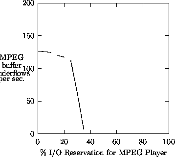 Providing QoS in Overloaded System by Resource ReservationFigures 9 and 10 depict the effects of resource reservation on an MPEG-1 player under CPU and I/O overloads, respectively. In the CPU load experiment, the MPEG player was run against 8 concurrent instances of the onoff program. In the I/O load experiment, the MPEG player was run against 10 I/O processes that were accessing random locations on the disk that holds the MPEG movie. In all cases, the file system was running in reservation domain #1 with a fixed 20% CPU reservation (where applicable). The MPEG player was running in reservation domain #2. The I/O workload was running in reservation domain #3, and each competing instance of onoff was running in its own reservation domain without any explicit reservations. In all cases, we varied the corresponding resource reservation of domain #2.