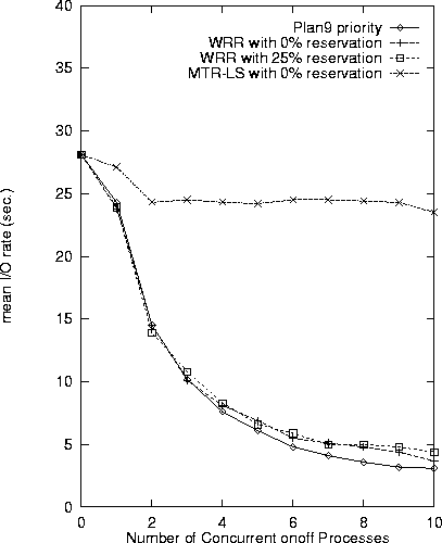Experimental SetupAll experiments were run on a Micron Millenia PC with an Intel Pentium processor running at 133MHz. The PC has a Talisman XL MPEG-1 decoder card. The experiments compared three scheduling algorithms: the original Plan9 scheduler, which is a priority based scheduler, that adjusts the priorities of processes according to their CPU consumption, the MTR-LS scheduler, and a weighted round-robin (WRR) scheduler. The first experiment runs a MPEG player under CPU and I/O overload. The MPEG-1 player has 10 read-ahead threads, that read a movie from the local disk and send it to the MPEG decoder card. The MPEG player requires both I/O and CPU resources. We repeatedly created CPU overload by running multiple copies of the onoff program. Each copy of this program consumes 11ms of CPU and then sleeps for 5ms. The onoff program poses a challenge to most CPU schedulers, since it consumes CPU with a duty cycle of about 60%, and it sleeps frequently.
