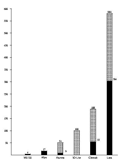 The numbers for Harvest [3] and Cheetah are taken from [11] and converted to Mbps. Both systems run on a 200 MHz PentiumPro machine like the Lava hit-server. Harvest runs on top of the BSD operating system, Cheetah on top of MIT's Xok system. IO-Lite [16] runs on a 233 MHz Alpha station with two 100Mbps network adapters. For comparison with industry-standard servers, we include numbers for Microsoft's Internet Information Server 4.0 running on a 166 MHz Pentium with Windows NT 4.0. Afpa [15] is an NT-based server running on a Pentium 166 processor. Both the MIIS and Afpa peformance have been measured in our lab by eliminating all client and network bottlenecks and increasing load until server was saturated. Similar to our experiment, the measurements for Cheetah, Harvest, MIIS, and Afpa are based on a LAN with no competing traffic; get requests are always served from the systems' respective main-memory caches. All systems implement the HTTP functionality; for Lava however, the client library translates HTTP requests to object-protocol requests on the client side.