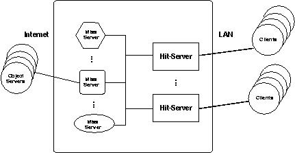 The server architecture consists of two types of modules that cooperate to manage a large RAM cache of objects (shown in Figure 1). A hit-server is a highly-optimized generic module (a dedicated machine) that handles client requests that hit in the object cache. Miss-servers handle client requests that miss in the object cache. Miss-servers also implement application-specific policies for managing the hit-server cache and for distributing objects to clients. Multiple, different miss-servers can be combined with a single hit-server or with multiple hit-servers (see Section 5).