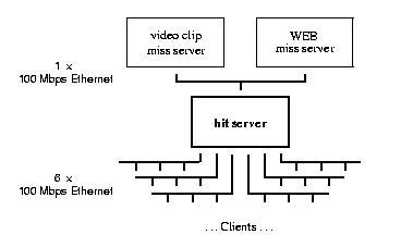 The SMC EtherPower 10/100 PCI network cards we use support 100Mbps Ethernets. They are based on the DEC 21140AE (``Tulip'') controller chip. Since the machine has only 4 PCI slots on its motherboard, we had to use an additional PCI bridge (DEC 21152) for connecting 7 Ethernet cards. In our experimental setup (Figure 2), 6 Ethernets are used as client networks, 4 of them are connected with the motherboard through the additional bridge. The seventh Ethernet connects the hit-server with the miss-servers.