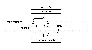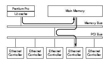 Both components communicate via the main memory: the processor accesses the main memory through the memory bus and the Ethernet controller through the PCI bus and the memory bus.