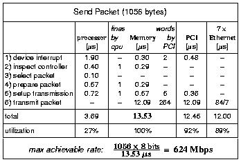 In Table 1, the costs of these six steps are estimated and given for the critical components: processor, memory bus, PCI bus and Ethernet buses. Due to buffering and pipelining, these components can to a large degree work in parallel. However, main-memory reads through the PCI bus always require corresponding memory-bus activity.