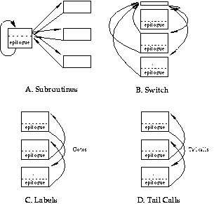 There are several ways of dispatching these service routines; Figure 1 shows the four most common. These are: subroutines called from an inner loop, a large "switch" statement, directly addressable labels, and function calls relying on tail call optimization. SimICS primarily uses addressable labels using GCC (Stallman 1992), but can also run using tail recursion.
