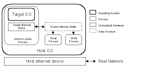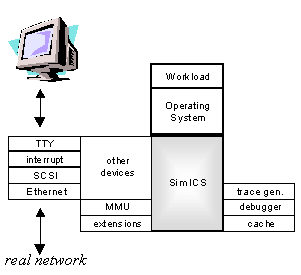 SimICS/sun4m can boot unmodified operating systems, including Linux 2.0.30 and Solaris 2.6, directly from snapshots of disk partitions. To support essentially arbitrary code, we implemented binary-compatible simulators for several devices, including SCSI, console, interrupt, timers, EEPROM, and Ethernet. The Ethernet simulation hooks into the host and allows the virtual workstation to appear on the local network with full services available (NFS, NIS, rsh, etc). Ethernet and console traffic can be recorded for future playback.