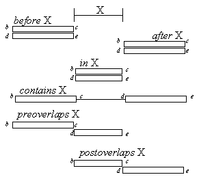 Region intervals are particularly useful for representing the result of applying a region relation operator. Given any region X and a region relation op, the set of regions which are related to X by op can be represented by exactly one region interval, as shown in Figure 4.
