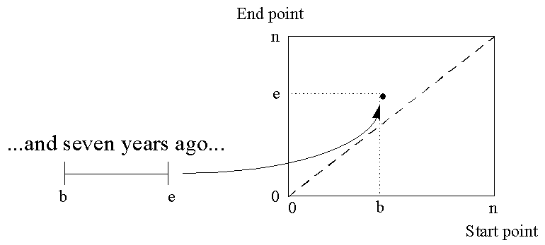 Figure 5: A region [b,e] corresponds to a point in region space.