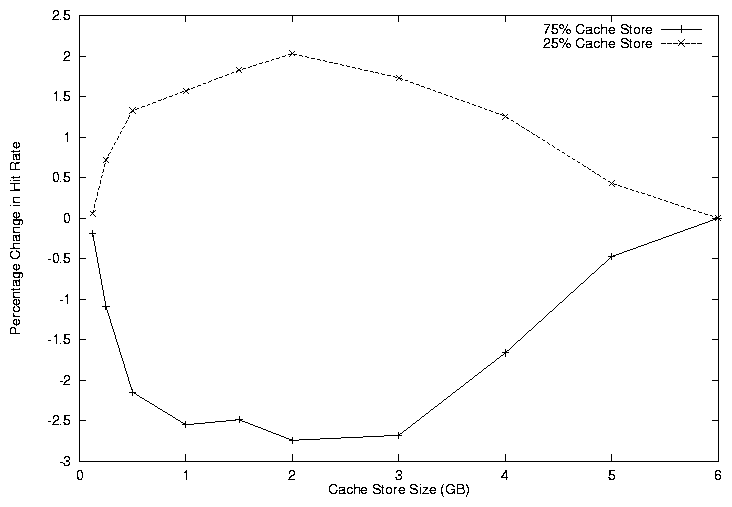DavisSim uses a user-defined function that determines whether incoming requests traverse the high-bandwidth or the low-bandwidth link. We subdivide the cache into two portions: we use 75% of the cache store for the slow link, the rest for the other link. The resulting hit rates are shown in Figure 6. The graph represents the difference in the hit rate when the cache is subdivided to hit rates when the cache is not subdivided and demonstrates that at small and large cache sizes there is not much benefit to using subdivided caching policies. However, at medium cache sizes the hit rate for the slow link is improved by 2%, with a decrease in the hit rate for documents over the fast link. These results, demonstrate that subdividing the cache can adjust the hit rates for different sets of objects when the cache is large enough that objects are not removed immediately and not so large that all objects fit within the cache.