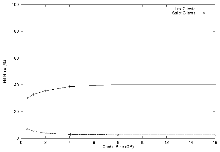 In the second experiment, we look at the effects of changing the cache size on multiple coherency policies. In this experiment we use a constant k of 0.5 for the lax clients. The results of the experiment, shown in Figure 5, demonstrate that hit rates improve as the cache size increases for the lax clients. However, we see the hit rates decrease for the strict clients. The reduction in the hit rates for the strict clients is due to the greater reuse of the objects by the lax clients. When the cache is small, it is more likely that an object will not exist in the cache and therefore the the lax clients will miss more often, resulting in objects that are fresh for small k values. However, as the cache size increases, the lax clients requests will generate more hits, thereby decreasing the number of objects that are fresh for small k values.