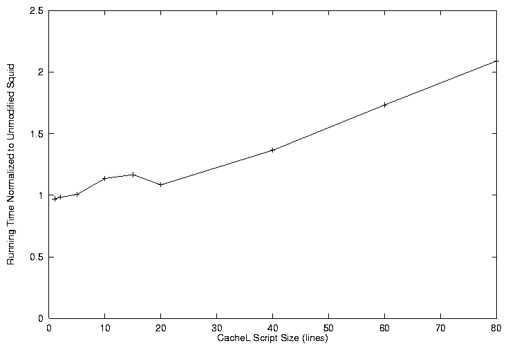 We now describe an experiment for assessing the overhead of using extensible policies. We wish to measure the overhead of generating events, interpreting CacheL scripts, and taking appropriate actions. Our experiment involves specifying a script to handle Access-Inline events. These events occur every time a hit occurs for an object. Therefore, when we ran the experiment we specified a trace where we achieve a 100% hit rate after a warmup period. In our experiment we wrote the coherency policy contained within Squid, including special cases, as a script, which consisted of 20 lines of CacheL code.